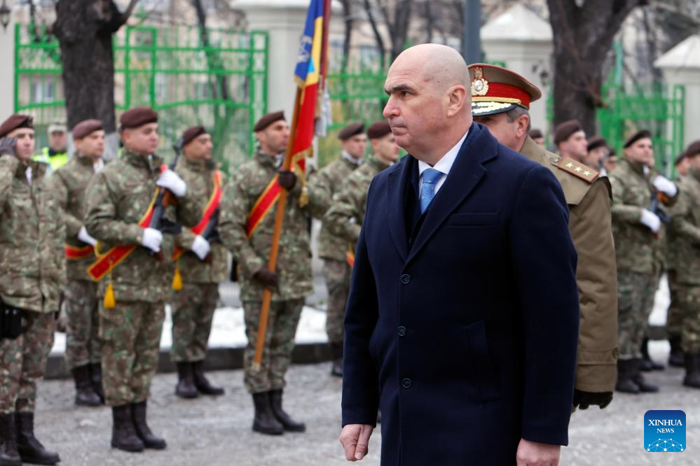 Romanian Prime Minister Ilie Bolojan inspects the honor guard during a ceremony marking the Day of the Union of the Romanian Principalities in Bucharest, Romania, on Jan. 24, 2026. (Photo by Cristian Cristel/Xinhua)