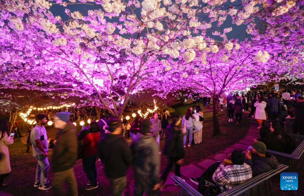 People view illuminated cherry blossom trees during the Blossoms After Dark event at David Lam Park in Vancouver, British Columbia, Canada, on March 27, 2026. The two-night free outdoor event features illuminated cherry blossoms, performances, food vendors and interactive activities. (Photo by Liang Sen/Xinhua)