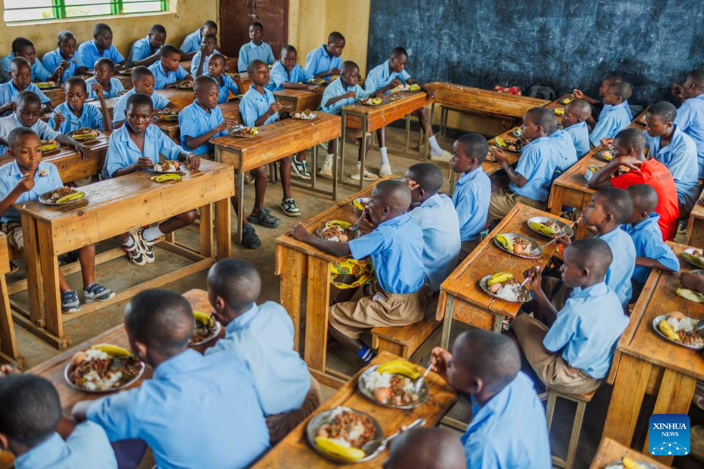 Children have lunch at their classroom at a school in Bugesera District, Eastern Province in Rwanda, on Jan. 20, 2026. Under a children-supporting program launched in 2023, children here are offered meals in schools to address their nutrition problems. (Photo by Cyril Ndegeya/Xinhua)