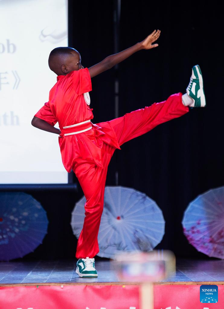 Jaden Jacob from the Motswedi Community Junior Secondary School performs Chinese Gongfu during his talent show at the final of the "Chinese Bridge" Chinese Proficiency Competition for Botswanan secondary school students in Gaborone, Botswana, March 27, 2026. The final of the "Chinese Bridge" Chinese Proficiency Competition for Botswanan secondary school students was held Friday in Gaborone, the southern African country's capital.(Photo by Tshekiso Tebalo/Xinhua)