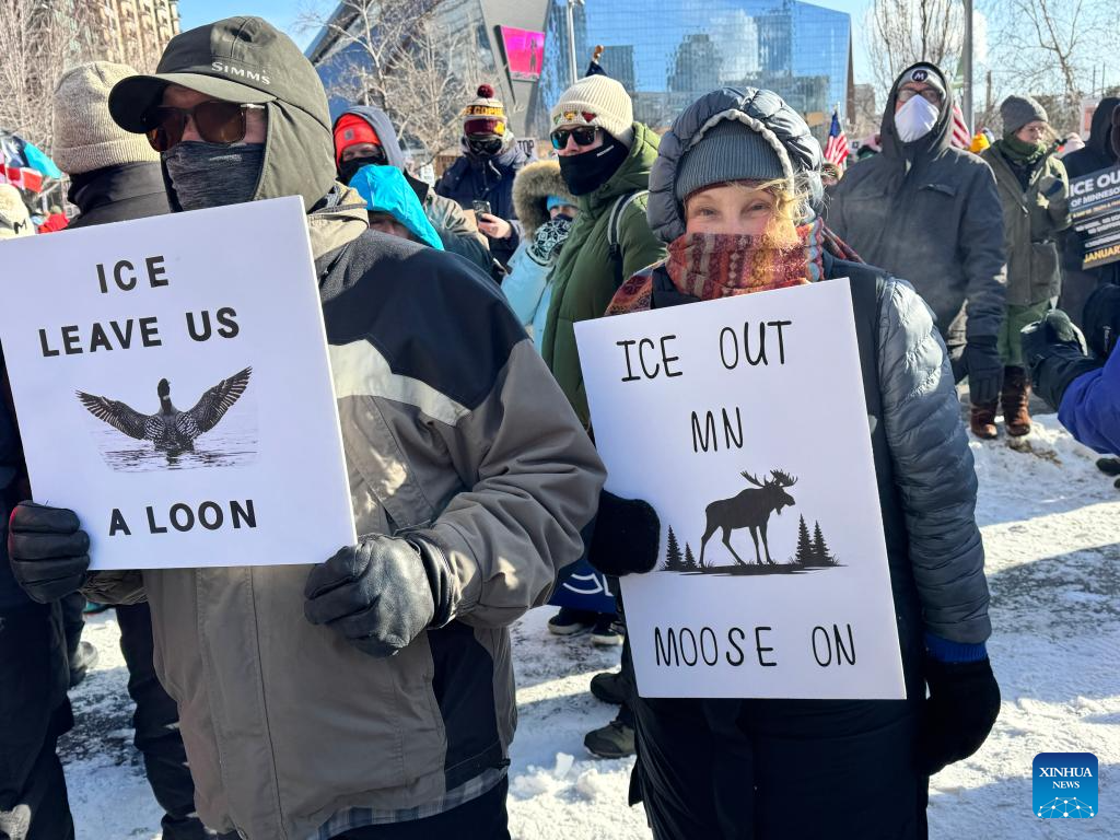 LOS ANGELES, Jan. 23 (Xinhua) -- Despite freezing temperatures of minus 24 degrees Celsius, about 15,000 protesters took to the streets on Friday, blocking airport roads, shutting down hundreds of businesses and staging what organizers described as one of the largest demonstrations in Minnesota's history to demand the removal of U.S. Immigration and Customs Enforcement (ICE).