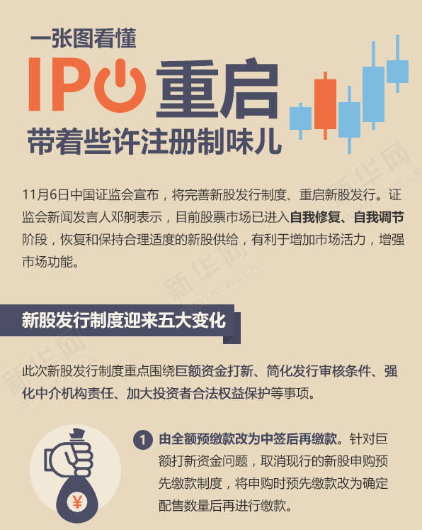 ????新華網(wǎng)北京11月6日電(記者 屈紹輝)6日中國(guó)證監(jiān)會(huì)宣布,將完善新股發(fā)行制度重啟新股發(fā)行。證監(jiān)會(huì)相關(guān)負(fù)責(zé)人表示,此次改革重點(diǎn)圍繞解決巨額資金打新、簡(jiǎn)化發(fā)行審核條件、強(qiáng)化中介機(jī)構(gòu)責(zé)任、加大投資者合法權(quán)益保護(hù)等事項(xiàng),這是新股發(fā)行體制改革的進(jìn)一步深化,朝著股票注冊(cè)制改革的方向又邁出了堅(jiān)實(shí)的一步。