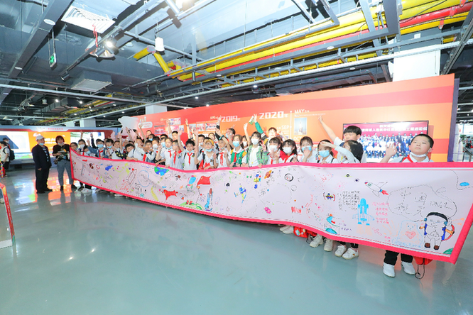 在現(xiàn)場,為了慶祝這場期待已久的航天科普展開幕,孩子們用一份“特別的禮物”——一幅繪滿了航天夢想與武漢名勝的5米長卷獻(xiàn)禮中國航天。在這幅長卷上,孩子們不僅生動地描繪出了武漢的眾多名勝特色,還用天馬行空的想象力展現(xiàn)了自己的航天夢。展區(qū)內(nèi),孩子們在講解員的帶領(lǐng)下參觀形形色色的“國之重器”,了解中國航天發(fā)展史,并且通過VR等設(shè)備親自體驗(yàn)了一把“太空旅行”。在航天夢想體驗(yàn)營中,孩子們一起回顧了空間站發(fā)射的精彩瞬間,當(dāng)看到“長五B”成功升空時(shí),現(xiàn)場爆發(fā)出熱烈的歡呼和掌聲,加油聲此起彼伏,許多孩子還合唱《明天會更好》對中國航天獻(xiàn)上祝福。