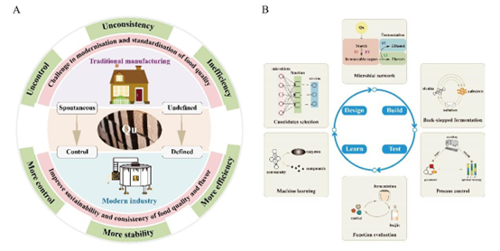 我国酿造食品(白酒、黄酒等)生产通常以曲作为发酵剂,以实现糖化和发酵的同步进行,该特点是东方酿造区别于西方酿造的典型特征之一。我国劳动人民在长期的生产实践中,发明了许多不同用途和特点的曲,酿造出了品种繁多的各色酒类。曲的制作以谷物作为培养基质在合适的条件下从酿造环境中富集微生物,并逐步形成独特的“菌系-酶系-物系”为一体的微生态系统。我国传统的制曲技术蕴含着许多科学道理有待深入解析,如“曲中微生物群落和酶系的组成特征、演替规律和代谢功能是什么?”“制曲过程中微生物成员间及其与环境的相互作用机制是什么”“传统生产中微生物群落形成及代谢产酶的驱动机制是什么?”以及“如何构建合成群落复刻原位菌群的代谢特征?”等。