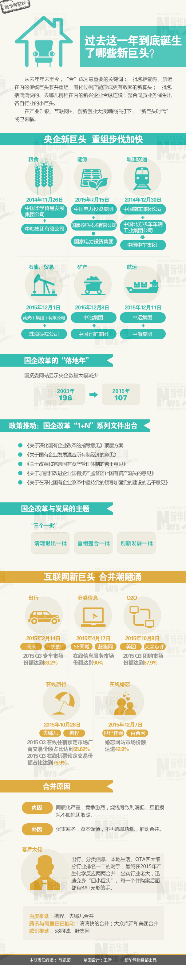 一批包括能源、航運(yùn)在內(nèi)的傳統(tǒng)巨頭兼并重組,力求消化過(guò)剩產(chǎn)能以成為更有效率的領(lǐng)軍者;一批包括滴滴快的、去哪兒攜程在內(nèi)的新興企業(yè)合縱連橫,整合同質(zhì)業(yè)務(wù)催生出各自行業(yè)的小巨頭。