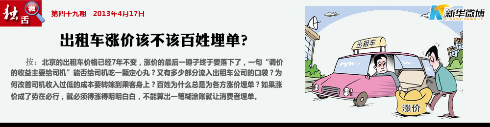 一粬:需考慮全國(guó)人民的感受 反對(duì)出粗車(chē)漲價(jià),北京出租車(chē)漲價(jià)的理由居然是根據(jù)北京居民和工薪階層工資上漲幅度為理由,確實(shí)是特權(quán)利益階層短視經(jīng)不起推敲的謬見(jiàn),北京是全體國(guó)家公民一生中最少去一次的城市,所有窗口行業(yè)的收費(fèi)確實(shí)不只是一個(gè)城市的小事情,須思考全國(guó)人民的感受。
