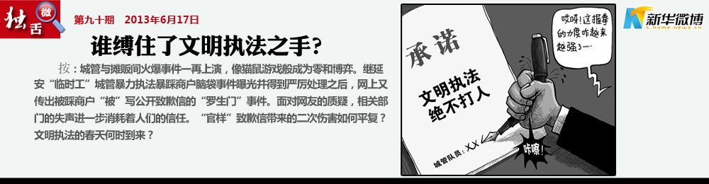 文明執(zhí)法是個(gè)偽命題? 觀看延安城管視頻,我們得出這樣的結(jié)論:文明執(zhí)法是個(gè)偽命題。想讓城管文明執(zhí)法,結(jié)果必然是:小攤販不怕城管,敢和城管對(duì)抗叫板,那么多城管隊(duì)員圍著一個(gè)小攤販,無法讓小攤販服從命令,結(jié)果不文明。