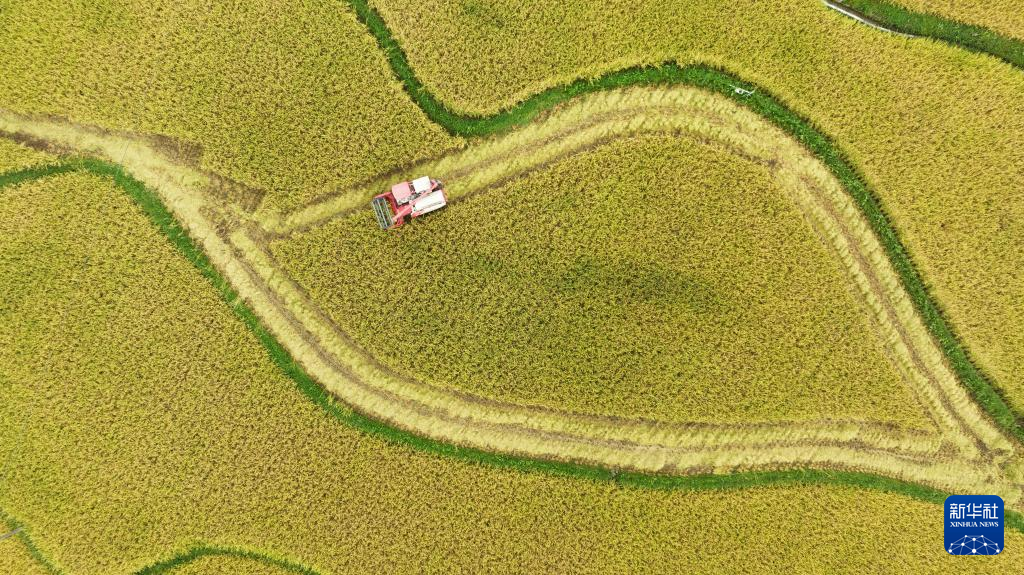 9月11日,农机手驾驶联合收割机在贵州省绥阳县旺草镇水稻种植基地里收割水稻(无人机照片)。