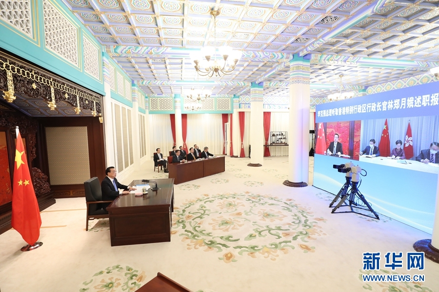 1月27日,國務院總理李克強在北京中南海紫光閣以視頻連線方式聽取香港特別行政區(qū)行政長官林鄭月娥2020年度的述職報告。國務院副總理韓正出席。新華社記者 王曄 攝
