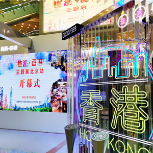 此次主題展展臺(tái)外觀通透明亮,內(nèi)部搭配錯(cuò)落有致的霓虹招牌,還呈現(xiàn)香港古跡和香港街道的場景,讓觀眾身在北京也能感受到香港豐富多元的都巿面貌,體驗(yàn)濃厚的“港風(fēng)”。展覽分為六大主題,包括“香港連接內(nèi)地與世界的橋梁功能”“商貿(mào)金融和創(chuàng)新科技”“多元文藝發(fā)展”“薈萃古今中外文化的特色”“綠色城市風(fēng)光”“京港合作交流”。展臺(tái)還設(shè)有兩個(gè)互動(dòng)裝置,以富有趣味的方式讓參觀者“連系”香港,并為香港送上祝福。