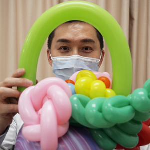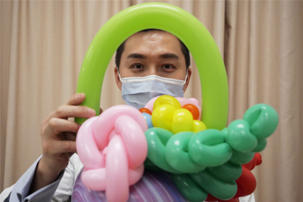 去年3月至5月,他組織一群志同道合的朋友手工制作了多款造型可愛的氣球贈送給醫(yī)護同仁,并在其任職的東區(qū)尤德夫人那打素醫(yī)院(簡稱“東區(qū)醫(yī)院”)專門設(shè)立了大型氣球擺設(shè)區(qū)。在疫情陰霾下,色彩繽紛的氣球墻為大家?guī)砼狻?/p>