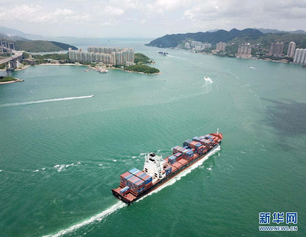 香港汀九橋附近,一艘貨輪駛向碼頭(6月11日,無人機照片)。新華社記者 李鋼攝