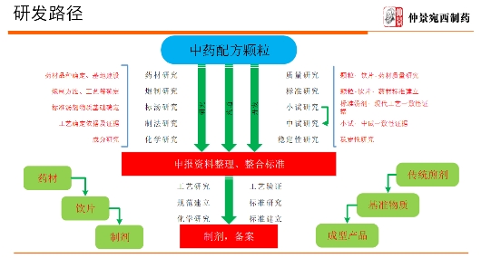 中藥配方顆粒的研制路線是從產(chǎn)品研制開(kāi)始,要經(jīng)過(guò)標(biāo)準(zhǔn)復(fù)核、現(xiàn)場(chǎng)檢查、專家評(píng)審等環(huán)節(jié),最終需獲得藥監(jiān)管理部門的備案許可。研制路徑的重點(diǎn)主要是前期大量文獻(xiàn)的調(diào)研、過(guò)程中質(zhì)量控制的一致性研究和工藝的穩(wěn)定性、有效性再評(píng)價(jià)等,對(duì)企業(yè)的研發(fā)、人才及經(jīng)濟(jì)方面的投入要求非常高。