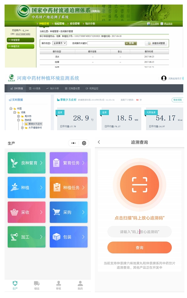 依托國(guó)家中藥材流通追溯體系、河南中藥材種植環(huán)境監(jiān)測(cè)系統(tǒng)、宛西制藥ERP信息系統(tǒng),企業(yè)建成中藥材及中成藥生產(chǎn)流通可追溯體系,實(shí)現(xiàn)從基地藥材、中藥飲片、生產(chǎn)過(guò)程、質(zhì)量檢測(cè)、市場(chǎng)流通全流程的業(yè)務(wù)管理和質(zhì)量溯源管理。通過(guò)機(jī)制創(chuàng)新、優(yōu)化流程,實(shí)現(xiàn)統(tǒng)一管理,滿足強(qiáng)化企業(yè)質(zhì)量管控。