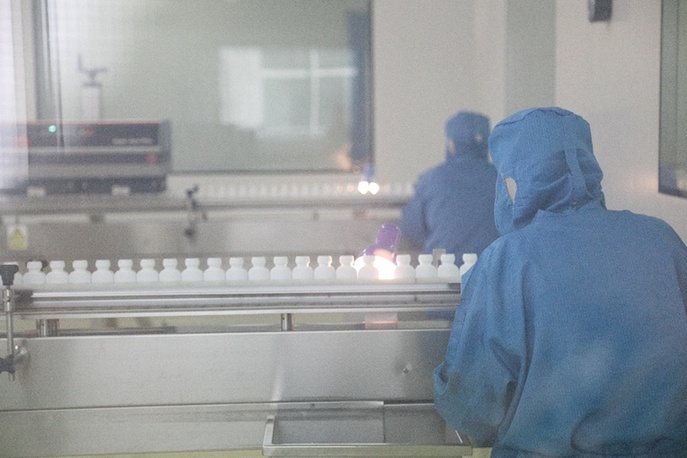生產(chǎn)車間內(nèi),工人正在對(duì)藥品進(jìn)行加工