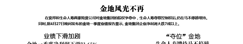 險資“咄咄逼人” 股權之爭何時了? 根據(jù)金融街一季報顯示,除了第一大股東北京金融街集團為國有法人外,十大股東中的其他均是機構投資者:4家保險、3家信托和2家基金重倉。 4月底和諧健康險舉牌后,安邦系已經(jīng)成為第二大股東。加上舉牌后的和諧健康險,其余九大股東總共持倉為13.45%。其中,安邦保險子公司和諧健康險一季度持股金融街5162.6萬股,占比1.71%,位列第三大股東。 5月6日,金融街控股股東金融街集團及其一致行動人增持了公司股份55,000,000股,占公司股份總數(shù)的1.82%。增持后,大股東合計持有金融街股份總數(shù)的29.74%,逼近30%的收購邀約線。 |