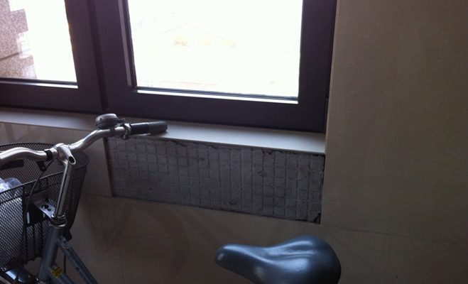 當記者與劉爺爺來到他居住的樓門前時,發(fā)現(xiàn)大門并沒有門禁,劉爺爺對記者說,看上去豪華的大門,其實一點都不實用。記者試了一下,發(fā)現(xiàn)確實很沉重,如果孩子自己開門,估計很難打開。劉爺爺說這個小區(qū)的實際質量和宣傳相差甚遠,樓內的瓷磚有掉落現(xiàn)象,安全梯鋪設的十分簡陋。劉爺爺讓記者從十五層向下俯視,小區(qū)所宣傳的法式園林只是一些楊樹和柳樹。庭院中間的小涼亭連休息的椅子都沒有,基本都是擺設。