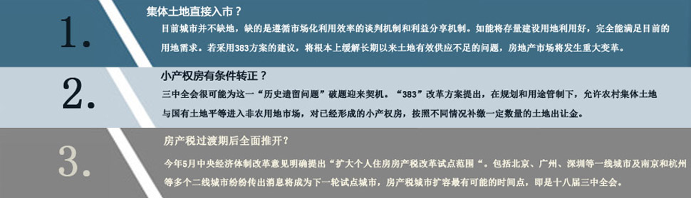 | 隨著十八屆三中全會(huì)的臨近,國(guó)務(wù)院發(fā)展研究中心專家的“383報(bào)告”引起熱議。 具體到房地產(chǎn)領(lǐng)域,“383方案”中共提到土地改革、小產(chǎn)權(quán)房、金融改革以及房產(chǎn)稅三個(gè)方面,與近期業(yè)內(nèi)討論很多的房地產(chǎn)長(zhǎng)效調(diào)控機(jī)制相關(guān)。 "土改"將成新的突破點(diǎn),為樓市變革指明新的方向。 [詳細(xì)] |