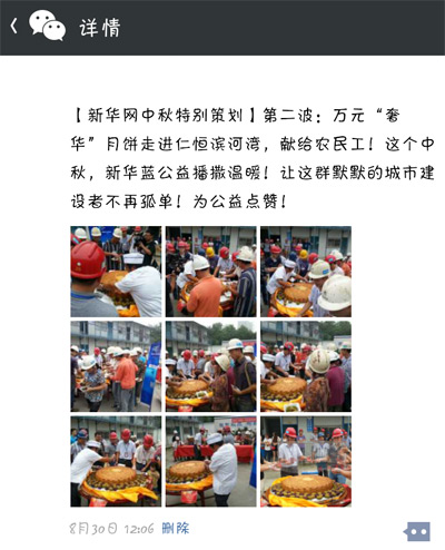 為了給這些身在異鄉(xiāng)的農民工兄弟送去溫暖,新華藍公益特別為他們舉辦了一場“中秋關愛農民工特別活動”,現場為工人捐贈月餅。8月29日上午10:30,本次活動在成都沙灣會展中心如期啟動。