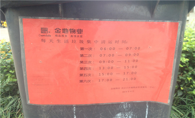 物業(yè)服務(wù)方面業(yè)主總體表示很滿意,其中一位陳姓業(yè)主告訴記者:“小區(qū)內(nèi)定期會(huì)有專人進(jìn)行綠化養(yǎng)護(hù)和衛(wèi)生保潔,環(huán)境非常好?!蓖瑫r(shí),記者還發(fā)現(xiàn)基本上小區(qū)內(nèi)垃圾桶上都貼有明確的每日清運(yùn)時(shí)間,非常人性化。