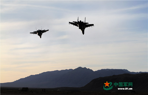 Two fighters from the aviation troop conduct low-altitude air raid on June 11, 2015. A guided-missile brigade under the air force of the PLA Guangzhou Military Area Command (MAC) maneuvered a long distance to the Gobi Desert to conduct a realistic attack and defense drill under complex electromagnetic environment with an aviation troop in mid-June, 2015. (Chinamil.com.cn/ Li Ming)