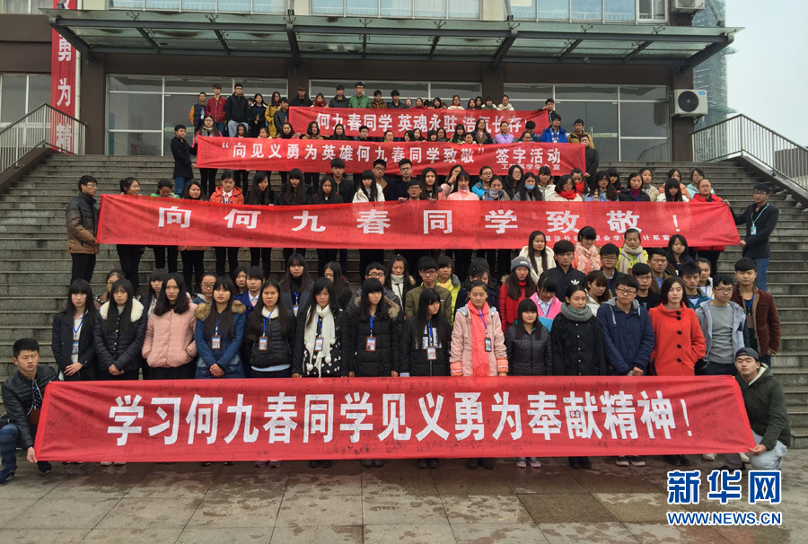 危難時刻挺身而出,英雄壯舉催人淚下。何九春的同學(xué)們紛紛自發(fā)的打出標(biāo)語,向何九春致敬。