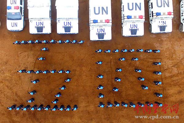 中國第四支駐利比里亞維和警察防暴隊(duì)隊(duì)員們在營地操場組成“五四”字樣,迎著初升太陽向祖國敬禮。