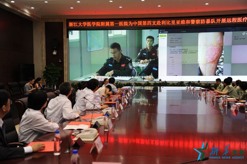 ????由中國第四支駐利比里亞維和警察防暴隊(duì)、浙江邊防總隊(duì)和浙江大學(xué)醫(yī)學(xué)院附屬第一醫(yī)院共同發(fā)起的“警民遠(yuǎn)程醫(yī)療協(xié)作”日前啟動。6位醫(yī)療專家通過遠(yuǎn)程視頻系統(tǒng),為遠(yuǎn)在利比里亞的患病隊(duì)員進(jìn)行會診。