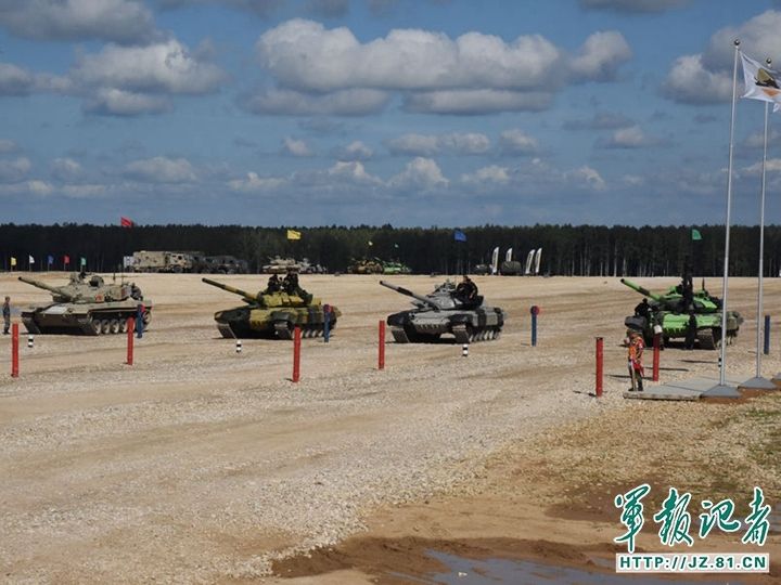 “坦克兩項”半決賽接力賽中國、吉爾吉斯斯坦、亞美尼亞、安哥拉的4輛坦克準(zhǔn)備出發(fā)。武元晉 攝