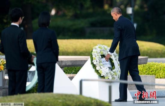 ????資料圖:2016年5月27日,美國(guó)總統(tǒng)奧巴馬乘直升機(jī)抵達(dá)日本廣島和平紀(jì)念公園附近,展開對(duì)和平紀(jì)念公園的訪問并獻(xiàn)上花環(huán)。