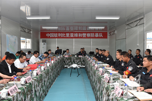 ??? 圖為中國第四支駐利比里亞維和警察防暴隊黨總支書記、政委徐曉偉(右一)主持召開聯(lián)創(chuàng)“三心”黨建座談會
