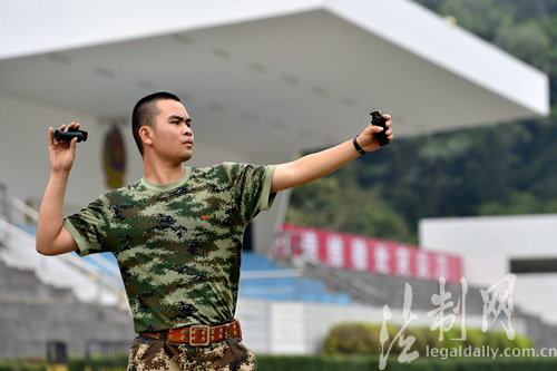 ????練兵場上空被投擲的防暴彈劃出一條條優(yōu)美的弧線?!鞍谁h(huán)、九環(huán)、十環(huán)……?!眻?bào)靶員響亮的聲音響徹練兵場。班長蔡錦彬投擲的防暴彈仿佛對(duì)靶心有向心力,一環(huán)比一環(huán)高;其他官兵也不甘示弱,剛剛創(chuàng)下的好成績不斷被刷新,戰(zhàn)士廖國勇猶如賽場上的一匹黑馬,憑著過硬的實(shí)力,一路過關(guān)斬將,奪得第一。(林宇華)