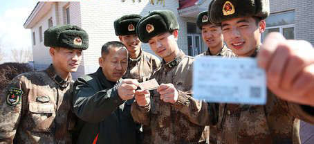 張青葉給官兵們送車票。圖片來(lái)源:軍報(bào)記者