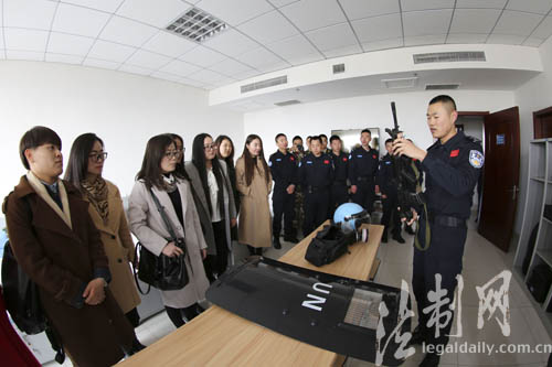 ????上午9時,一輛掛著“相約藍盔、愛在警營”紅色橫幅的大巴車緩緩駛?cè)刖牋I區(qū)。一下車,姑娘們饒有興致地參觀了警隊內(nèi)務(wù)設(shè)置和裝備展示,現(xiàn)場觀看了藍盔方陣扣人心弦的戰(zhàn)術(shù)表演,隊員們氣吞萬里的練兵激情、敢打必勝的過硬素質(zhì),一下子吸引了大家的眼光。在此之前,她們只是在心中默默仰慕那頂“藍色貝雷帽”,從電視上看到過威武帥氣的維和隊員。第一次如此近距離接觸,讓不少姑娘的心中蕩起層層漣漪。