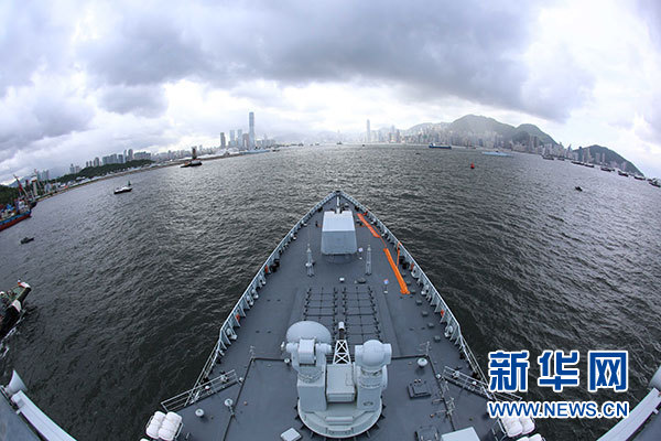 7月7日,海軍銀川艦駛?cè)胂愀郯捍薮a頭。當(dāng)日,正在執(zhí)行跨區(qū)機(jī)動(dòng)訓(xùn)練任務(wù)的中國(guó)人民解放軍海軍航母編隊(duì)抵達(dá)香港,參加香港回歸祖國(guó)暨中國(guó)人民解放軍進(jìn)駐香港20周年慶?;顒?dòng),受到香港特區(qū)政府和民眾熱烈歡迎。新華社記者 曾濤 攝