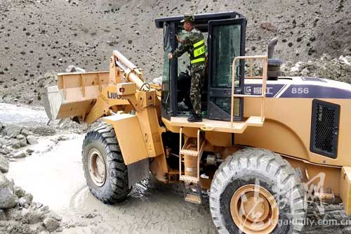 圖為邊防官兵正在指揮鏟車(chē)進(jìn)行搶修道路