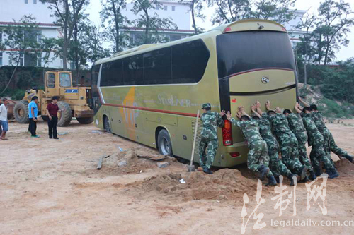 旅游大巴車后輪陷沙坑 秦皇島邊防官兵緊急救助