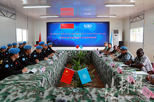 圖為中國駐利防暴隊與聯(lián)利團(tuán)裝備核查組召開會議