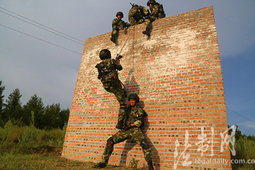 圖為特戰(zhàn)隊(duì)員在協(xié)同通過四米墻