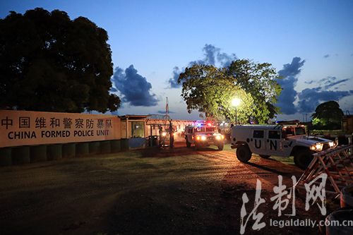 圖為天色漸暗,中國(guó)維和警察防暴隊(duì)巡邏組乘車駛出營(yíng)區(qū)