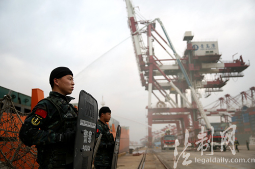 ????此次海上聯(lián)合反恐演練以阻止多名“涉恐分子”潛入港區(qū)及外輪企圖進(jìn)行恐怖活動(dòng)為背景,幾名“恐怖分子”駕車意圖混入油港區(qū)實(shí)施破壞,被識(shí)破后仍試圖強(qiáng)行進(jìn)入。與此同時(shí),前灣港集裝箱碼頭也發(fā)現(xiàn)幾名“涉恐分子”偽裝成船員,隨集裝箱貨輪進(jìn)入港區(qū)實(shí)施破壞行動(dòng),并在一艘即將離港的貨輪上劫持“人質(zhì)”,企圖逃離港區(qū)。面對(duì)如此復(fù)雜的局面,公安、邊檢、海關(guān)、國(guó)檢、港口等部門(mén)接到情報(bào)預(yù)警信息后,及時(shí)啟動(dòng)海上聯(lián)合反恐處突應(yīng)急預(yù)案,聯(lián)合反恐指揮部及時(shí)下達(dá)指令,參加演練單位立即行動(dòng),邊檢利劍突擊隊(duì)隊(duì)員迅速登輪控制“涉恐分子”,消防部門(mén)架設(shè)水槍撲滅引燃物品,海關(guān)、海事巡邏艇在集裝箱船舶周邊海域鋪設(shè)防油污圍欄,并收繳走私涉恐物資。成功處置險(xiǎn)情后,碼頭恢復(fù)生產(chǎn)作業(yè)。