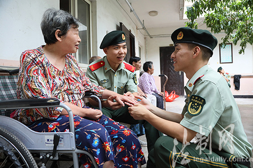 ????8月29日下午,江蘇邊防總隊連云港邊檢站面臨復(fù)退的戰(zhàn)士最后一次穿著軍裝走進(jìn)駐地敬老院,看望他們“認(rèn)親”的老人,送上他們退伍前的一聲祝福,并將“認(rèn)親”的老人交到留隊的戰(zhàn)友手中,將這份愛心傳遞下去。據(jù)悉,這個站“認(rèn)親”的傳統(tǒng)已經(jīng)延續(xù)了27年,每名官兵都有“認(rèn)親”的孤寡老人,他們和老人之間建立了深厚的感情。(錢逸帆 王鈺)