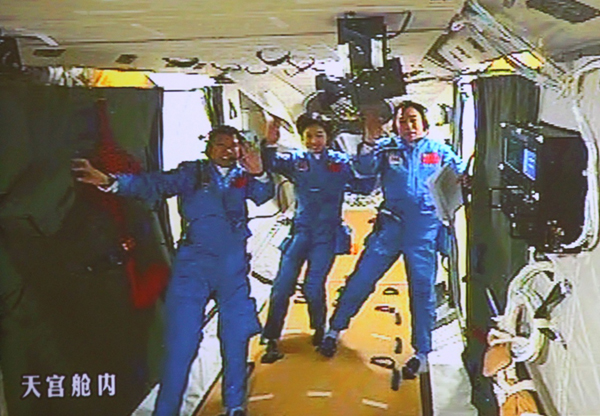 ????2012年6月18日,北京航天飛控中心大屏幕顯示航天員景海鵬、劉洋、劉旺(從右至左)在天宮一號實(shí)驗(yàn)艙內(nèi)。新華社記者 查春明 攝