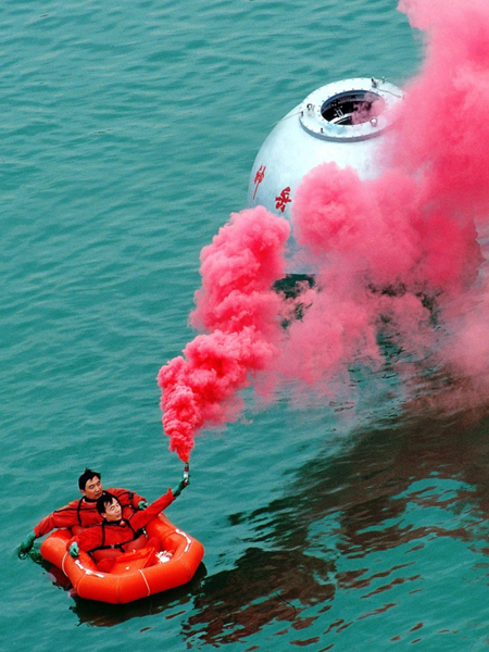 ????2006年12月26日,航天員景海鵬(前)、吳杰進(jìn)行水上出艙訓(xùn)練。新華社發(fā)(朱九通 攝)