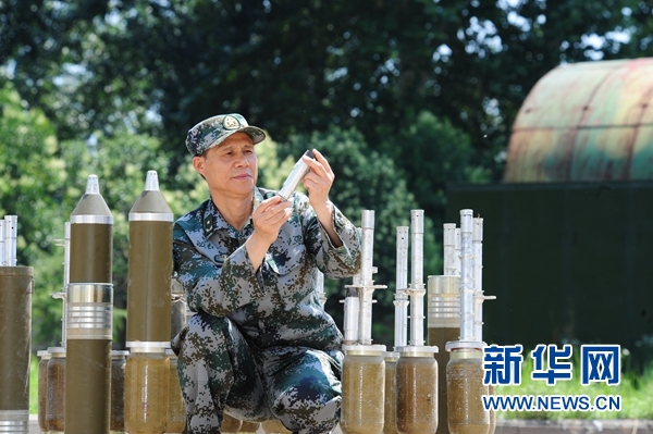 中國(guó)工程院院士、軍事科學(xué)院國(guó)防工程研究院研究員任輝啟檢查彈體作用情況(資料照片)?! ⌒氯A社發(fā)(侯藝兵 攝)