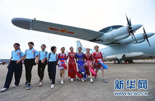 藍(lán)天春蕾女童在航展現(xiàn)場參觀(11月10日攝)。 新華社發(fā)(陳藝 攝)