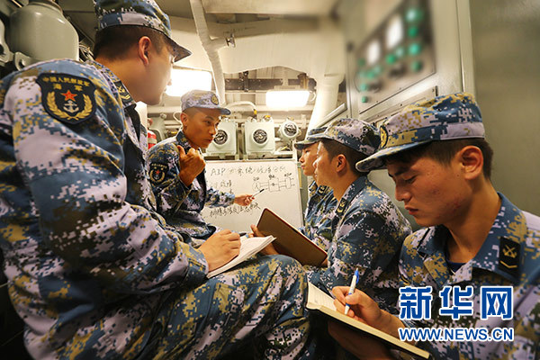 肖海生(左二)利用訓(xùn)練間隙為戰(zhàn)友講解AIP系統(tǒng)常見故障及處置方法(2017年6月2日攝)。 新華社發(fā)(韓林 攝)