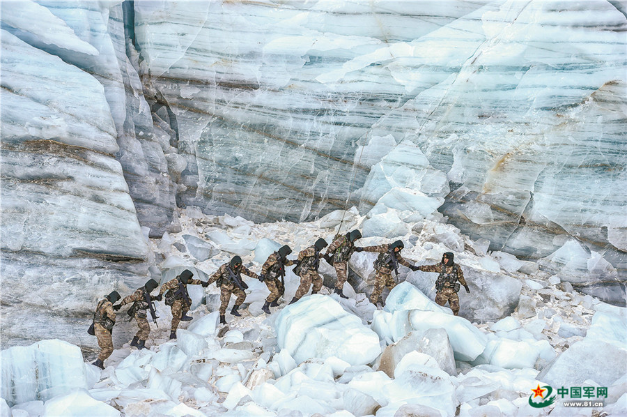 官兵手牽手通過冰川危險地帶。