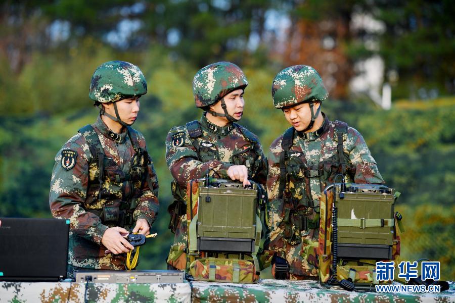 俞細(xì)文(左二)在野外訓(xùn)練場迅速架設(shè)通信臺(tái)站(12月11日攝)。新華社發(fā)(劉明松 攝)