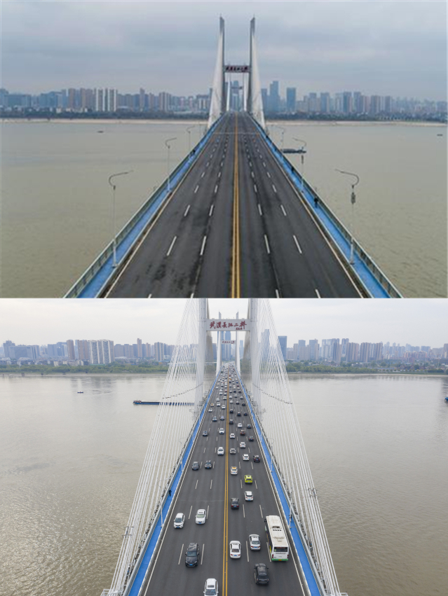 ▲上圖為2020年1月27日的武漢長(zhǎng)江二橋。來(lái)源:中國(guó)日?qǐng)?bào);下圖為2020年4月14日的武漢長(zhǎng)江二橋。新華社記者 才揚(yáng) 攝